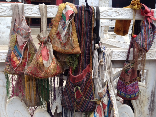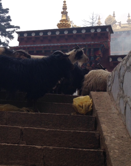 In this picture, Peter is readying to sacrifice some pine branches to Buddha at Dabao Monastery, the oldest monastery in the region. It is about 15 km outside of Shangri-La, and down a heavily rutted road and through a small village. This Monastery, unlike the huge more touristed and famous Songtsam Monastery in Shangri-La, is truly a place for the locals to worship. And it is also a special place because it is the only monastery in the region one of whose purposes is to protect animals from slaughter. Thus, as we climbed up to the monastery, the way was blocked by a gaggle of goats. The other pics are of various types of offerings from acolytes, including hand carved stone pieces: