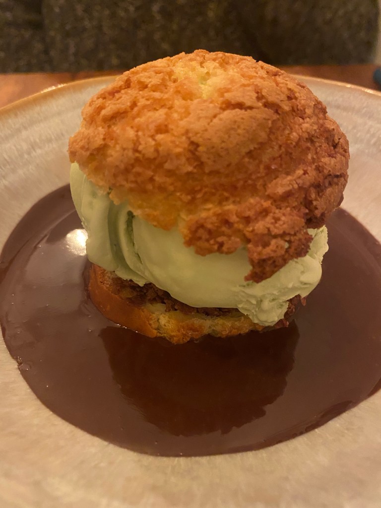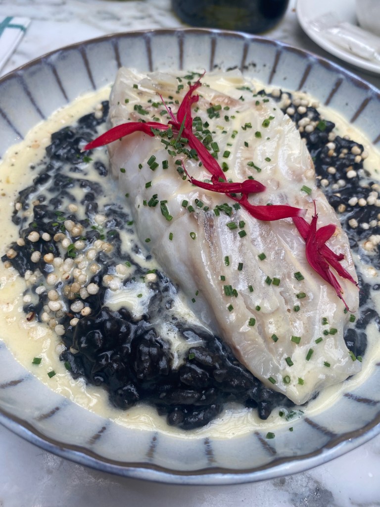 Do you all recall very nice department stores with elegant lunchrooms, many years ago. Well, the Bon Marche, in Paris, is probably the prototype. The Grand Epicerie is the department store’s building with unbelievable dining room and other eating areas. We had this fantastic fresh haddock over cuttlefish (like squid ink) risotto.